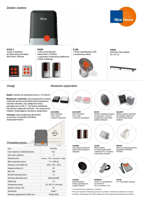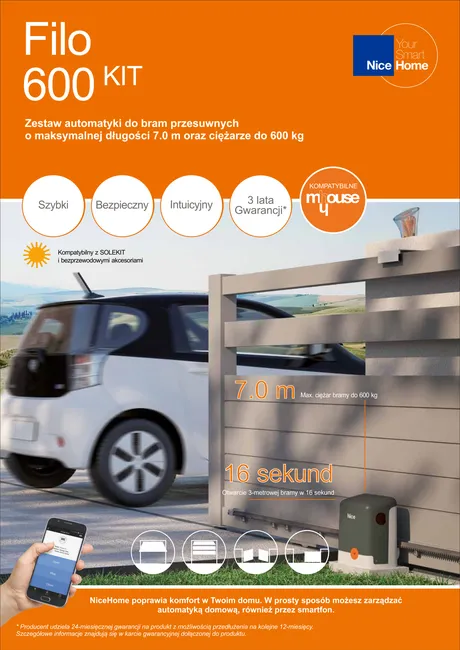 Zestaw automatyki Nice Home do zautomatyzowania bram przesuwnych o wymiarach : maksymalna szerokość do 7 m i waga do 600 kg. Zestaw w bogatej kompletacji – zawiera: siłownik z centralą, 2 piloty, zestaw fotokomórek, lampa sygnalizacyjna z wbudowana anteną, nylonowa listwa zębata 8 x 0,5m. Siłownik wyposazony w elektronicznie krańcówki pozwalajace na precyzyjne ustawienie położeń krańcowych bramy, jednoelementową odbudowa z logo Nice. Bogata centrala sterujaca zawierajaca wiele zaawansowanych funcji:automatycznych i programowalnych. Automatyczne: rozpoznawanie urzadzeń podlaczonych do wyjscia ECSBus, rozpoznawanie trybów urzadzenia, rozpoznawanie dlugosci bramy i ustawianie trybów zwolnienia. Programowalne: funkcjonowanie w cyklu „automatycznym” i ” półautomatyczny”, predkość „wolno”, „szybko”, 4 stpniowy wybór czasu pauzy w cyklu pracy ” automatyczny”, 4 tryby otwarcia bramy dla pieszych, 4 poziomy wyboru ustawień siły w odczycie przeszkód.